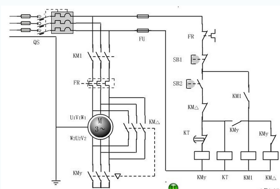 如上圖所示是用按鈕和接觸器控制的星三角降壓啟動的 控制電路。該線路 使用了三個接觸器、一個熱繼電器和三個按鈕。接觸器KM作引入電源用,接觸器KMy和KM△分別作星形啟動用和三角形運行用,SB1是啟動按鈕,SB2是星~三角轉換按鈕,SB3是停止按鈕,熔斷器FU1作為主電路的短路保護,熔斷器FU2作為控制電路的短路保護,FR作過載保護。