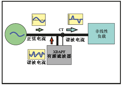 XDAPF通過外部CT測量負載電流或電網(wǎng)電流送到信號板進行處理,控制板完成負荷諧波電流的計算和諧波電流補償?shù)拈]環(huán)控制,并產(chǎn)生PWM驅動信號到驅動板,驅動板驅動逆變器的IGBT從而將所需的補償電流輸出到電網(wǎng),完成諧波濾除的功能。