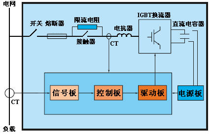 直流電容器為儲能元件并通過IGBT逆變器和接口電抗器電網(wǎng)輸出補償電流;直流電容同時通過電源板為信號板、控制板和驅動板提供工作電源。