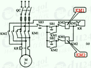 電動(dòng)機(jī)便反轉(zhuǎn)。同時(shí),串接在正轉(zhuǎn)控制電路中的常閉觸頭KM2斷開,起聯(lián)鎖保護(hù)作用。