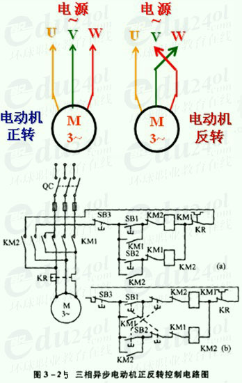 三相異步電動(dòng)機(jī)的正、反轉(zhuǎn)方法:任意調(diào)換電源的兩根進(jìn)線,電動(dòng)機(jī)反轉(zhuǎn)。