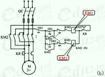 在圖(b)中,當(dāng)電動(dòng)機(jī)正轉(zhuǎn)時(shí),按下反轉(zhuǎn)起動(dòng)按鈕SB2,它的常閉觸頭斷開,使正轉(zhuǎn)接觸器線圈KM1斷電,主觸頭KM1斷開。與此同時(shí),串接在反轉(zhuǎn)控制電路中的常閉觸頭KM1恢復(fù)閉合,反轉(zhuǎn)接觸器線圈KM2通電并自鎖,